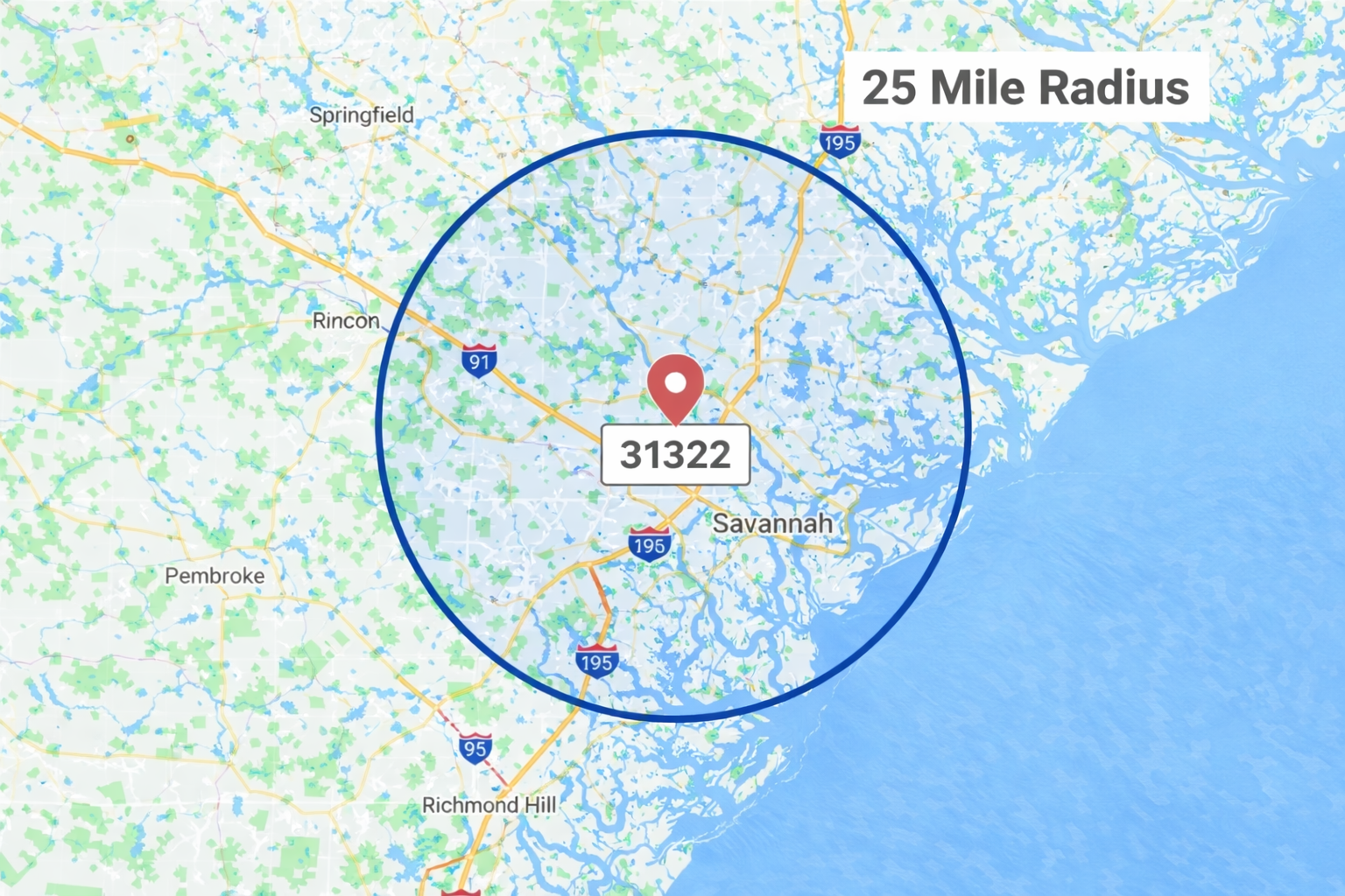Map showing a 25 mile radius circle centered on ZIP code 31322, west of Savannah, Georgia, covering surrounding areas including Richmond Hill, Pembroke, and Rincon.